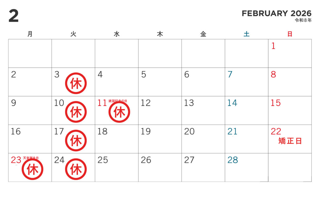 あらかじめご了承頂きます様、お願いいたします。※2月22日(日)は矯正日です。