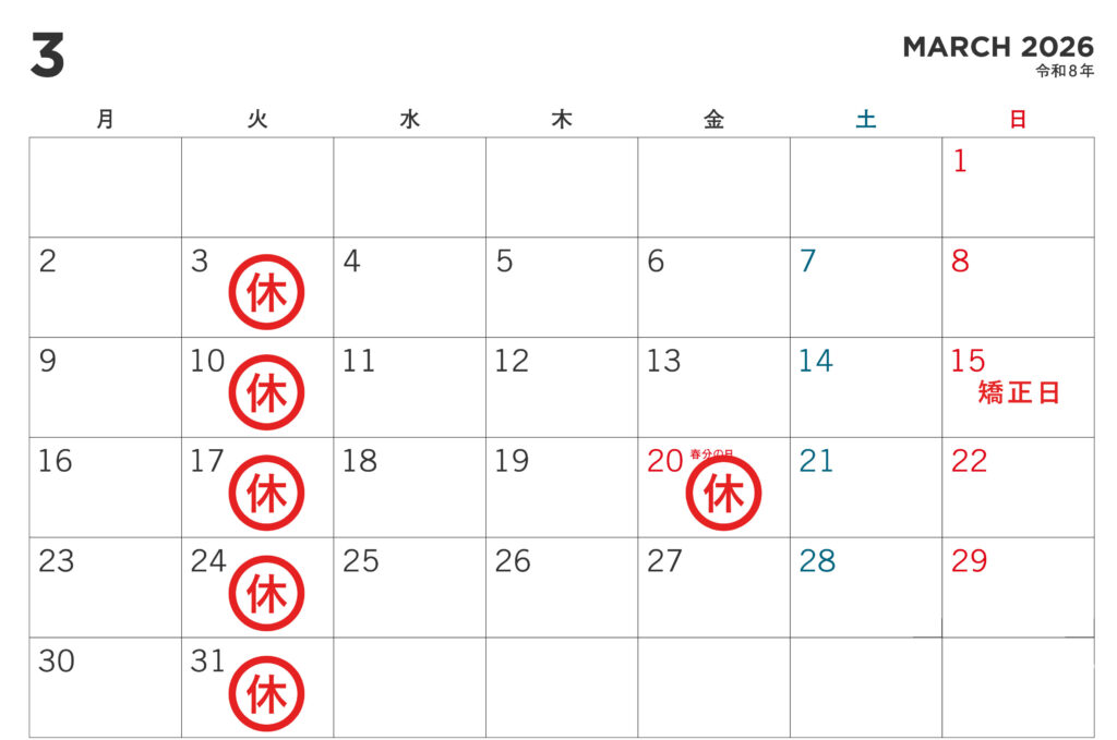 あらかじめご了承頂きます様、お願いいたします。※2/16、3/16 矯正日